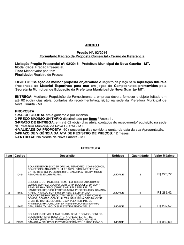 NEXT I PRESO N. 02×2016 Formulaic Pedro de Proposta Commercial Term ode Reference Licit PRESO Presence n: 02×2016 Prefecture Municipal de Nova Juanita MT. Modalidade: PRESO Presence. Tip: Minor