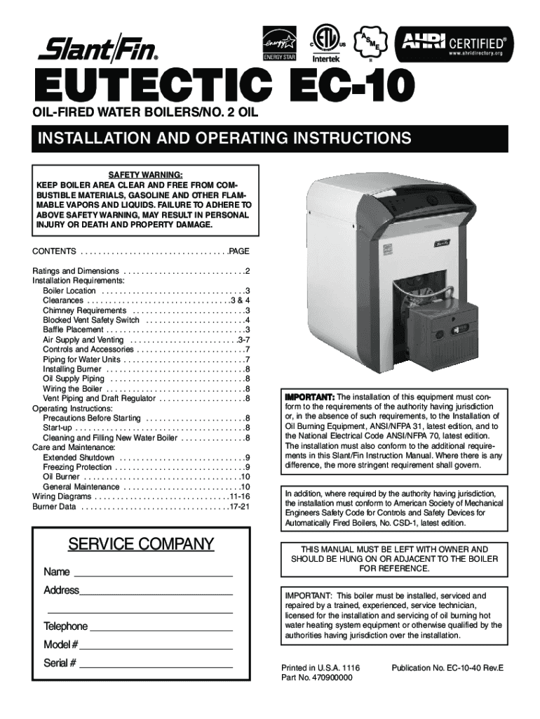EUTECTIC EC10OILFIRED WATER BOILERS×NO. 2 INSTALLATION AND OPERATING INSTRUCTIONS SAFETY WARNING: KEEP BOILER AREA CLEAR AND FREE FROM COMBUSTIBLE MATERIALS, GASOLINE AND OTHER FLAMMABLE VAPORS AND