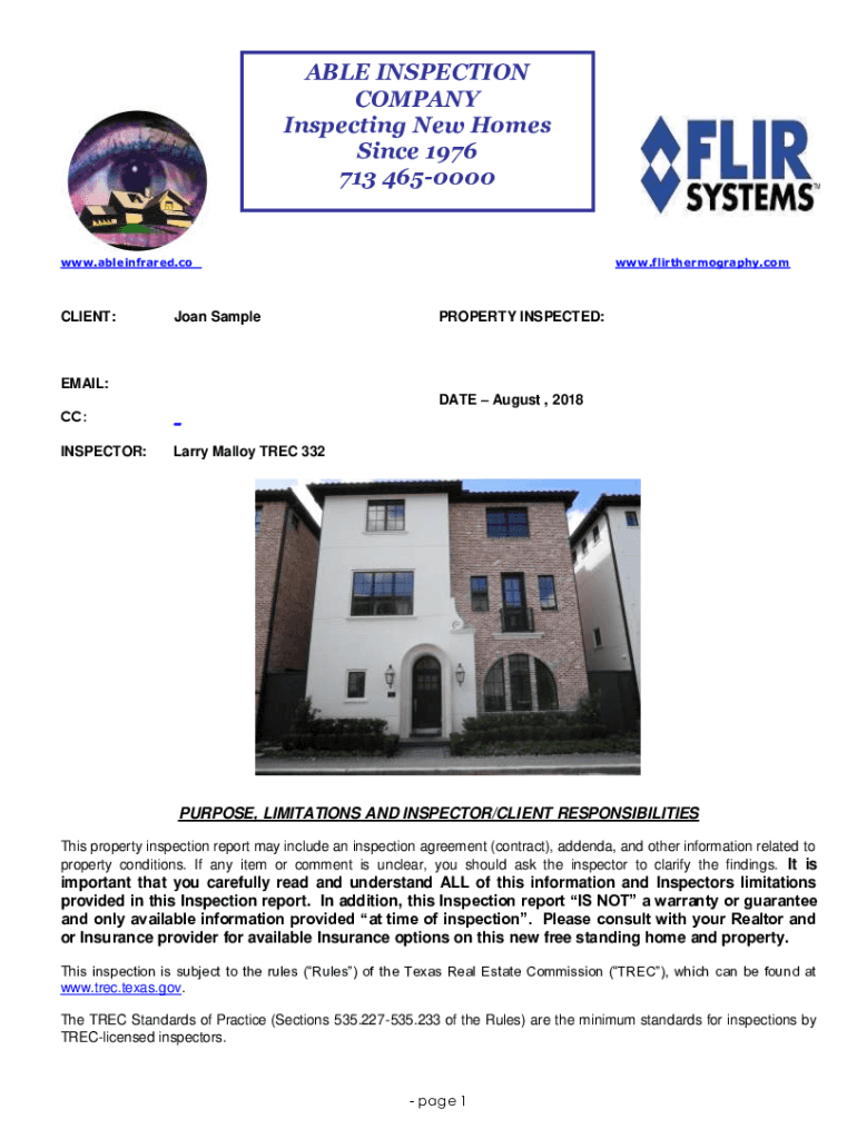 ABLE INSPECTION COMPANY Inspecting New Homes Since 1976 713 4650000www. Able infrared.client:Joan Sample.flirthermography.property INSPECTED:EMAIL: DATE August 2018 CC:_INSPECTOR:Larry Malloy TREE