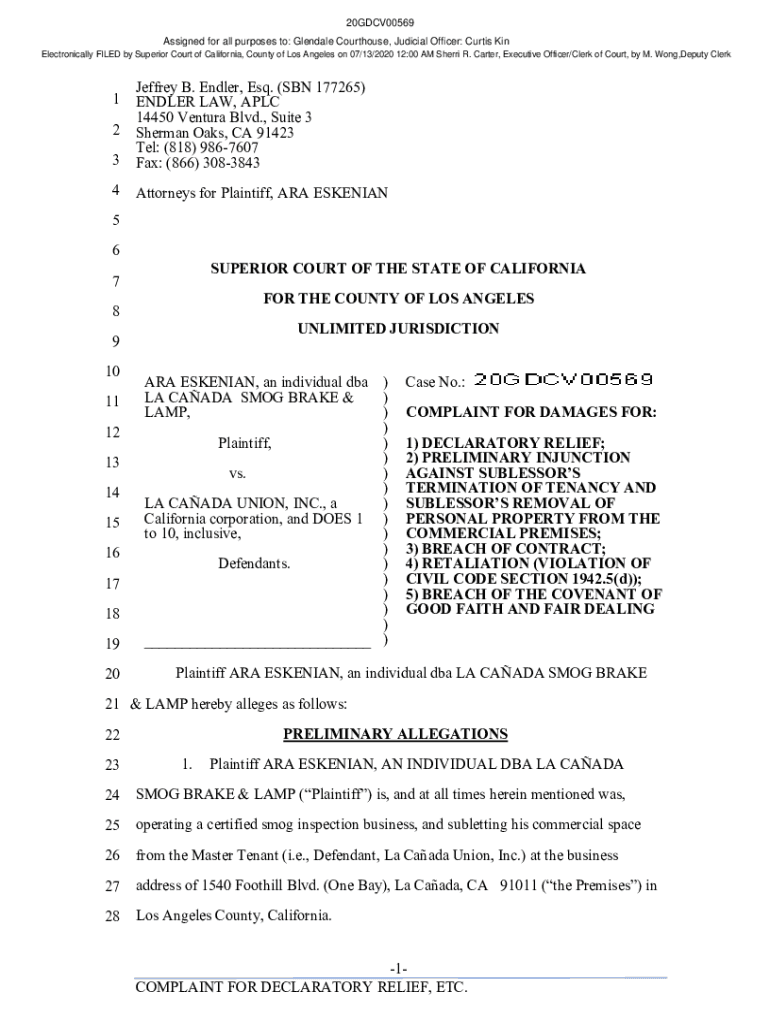 20GDCV00569 Assigned for all purposes to: Glendale Courthouse, Judicial Officer: Curtis Kin Electronically FILED by Superior Court of California, County of Los Angeles on 07×13/2020 12:00 AM Sherri