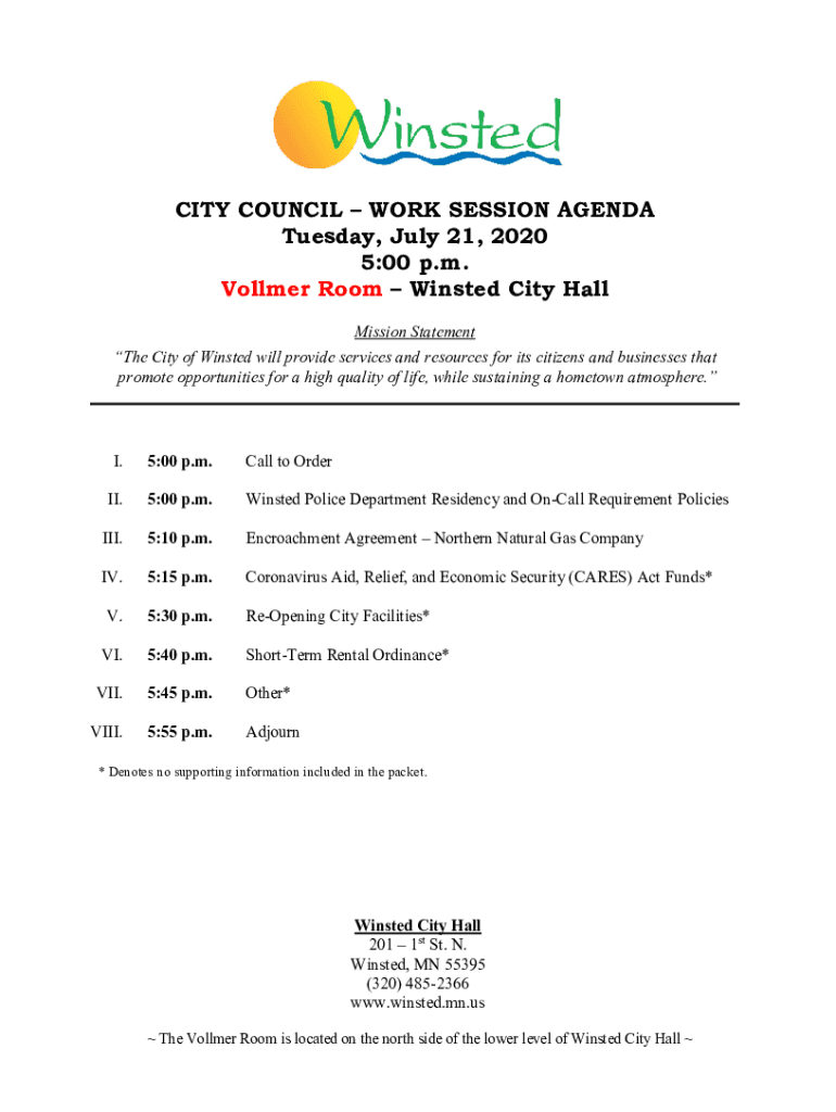 CITY COUNCIL WORK SESSION AGENDA Tuesday, July 21, 2020 5:00 p.m. Volume Room Winsted City Hall Mission Statement The City of Winsted will provide services and resources for its citizens and businesses