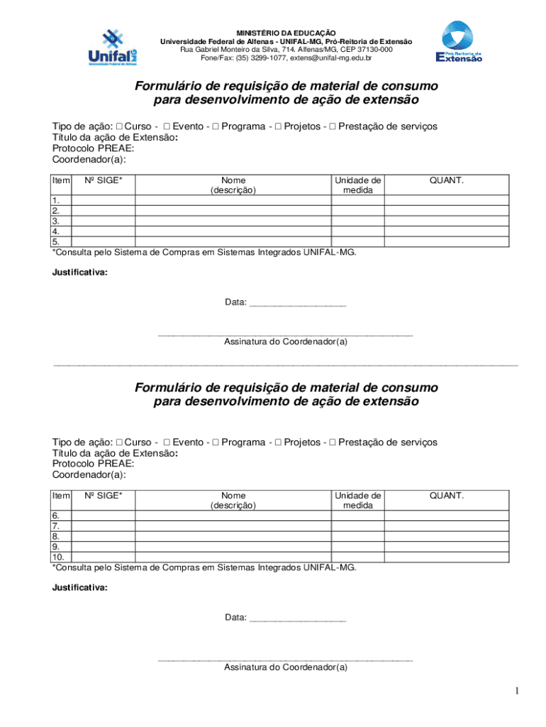 MINISTRY DA EDUC AO Universidade Federal de Alfenas UNIFORM, Pretoria de Extenso RUA Gabriel Monterey da Silva, 714. Aliens×MG, CEP 37130000 One×Fax: (35× 32991077, extent×uniform.edu.brFormulrio