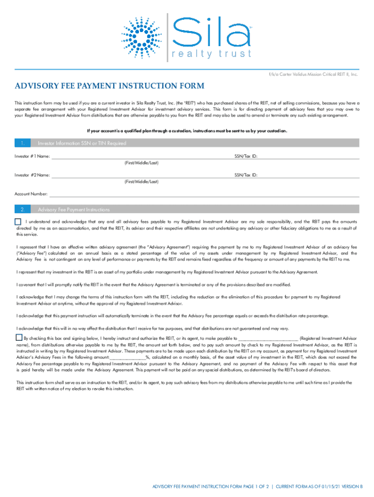 F×k/a Carter Valid us Mission Critical REIT II, Inc. ADVISORY FEE PAYMENT INSTRUCTION From This instruction form may be used if you are a current investor in Silk Realty Trust, Inc. (the \” REIT\”)