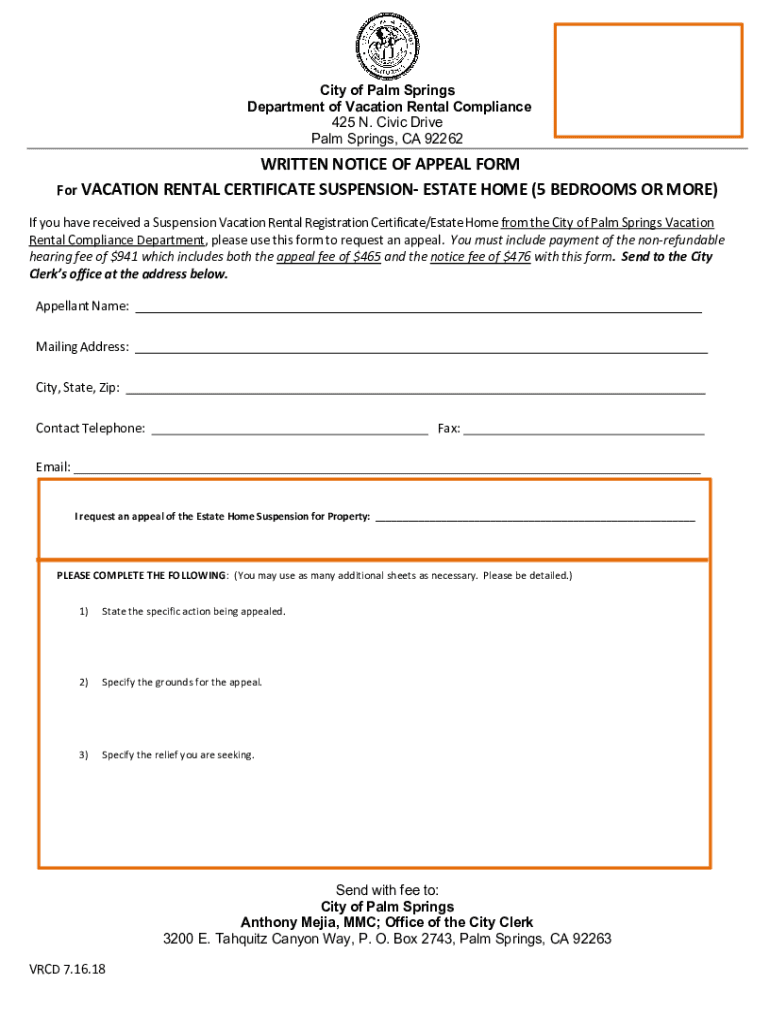 City of Palm Springs Department of Vacation Rental Compliance 425 N. Civic Drive Palm Springs, CA 92262WRITTENNOTICEOFAPPEALFORM ForVACATIONRENTALCERTIFICATESUSPENSIONESTATEHOME×5BEDROOMSORMORE×IfyouhavereceivedaSuspensionVacationRentalRegistrationCertificate×EstateHomefromtheCityofPalmSpringsVacation