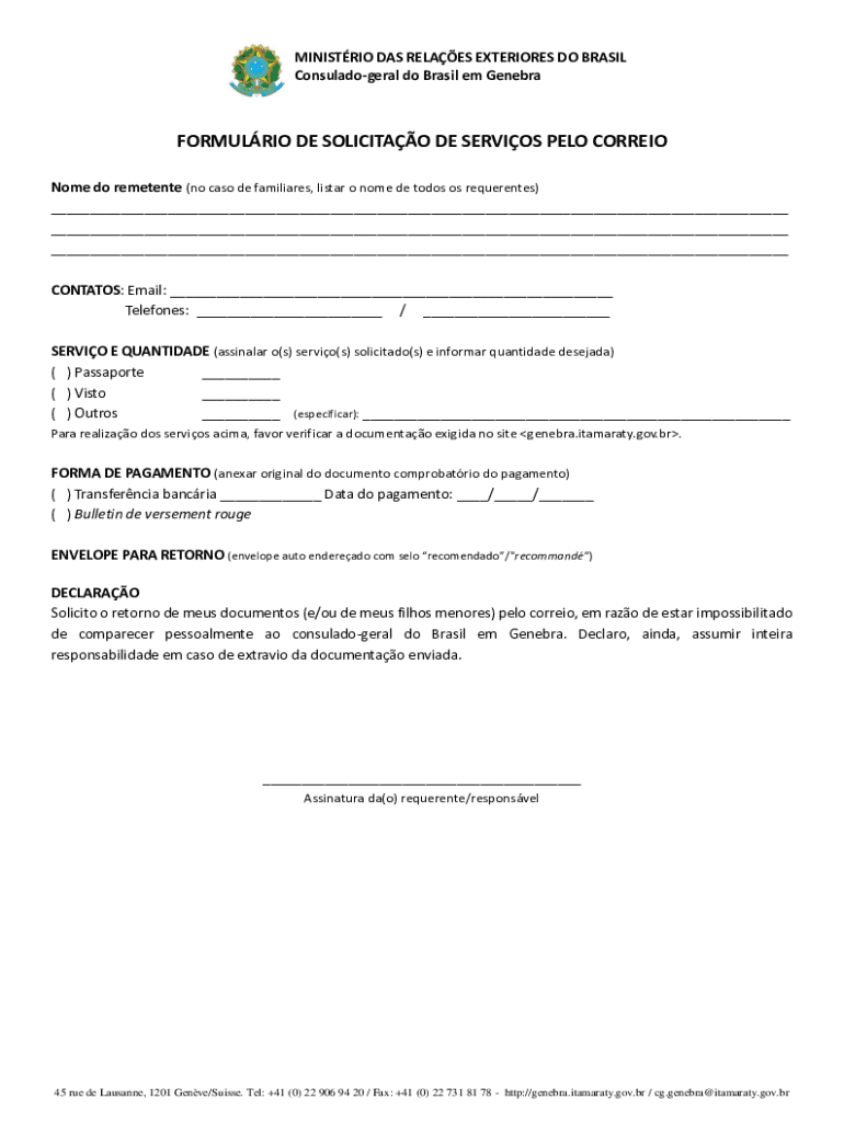 MINISTRY WAS RELATES EXTERIORS DO BRAZIL Consuladogeral do Brazil em GenebraFORMULRIO DE SOLICIT AO DE SERVOS POLO CORRECT Nome do reference (no case DE familiars, Lister o Nome de to-dos OS requires)
