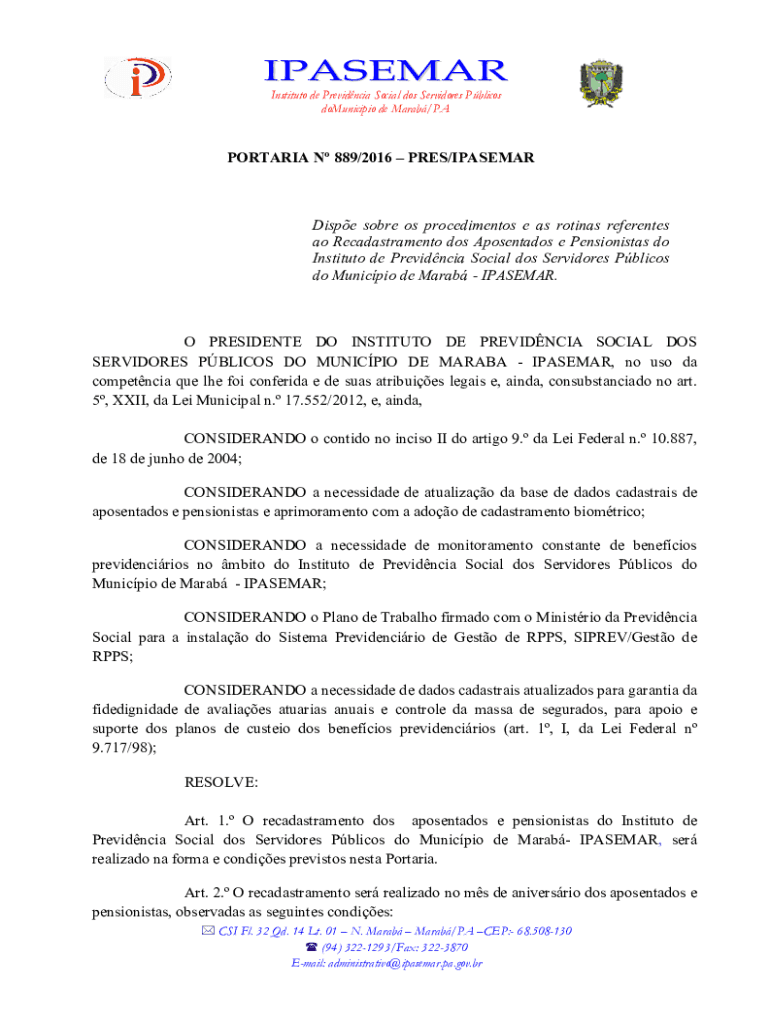 IP A S E M A R Institute de Previdncia Social dos Servitors Polices doMunicipio de Arab×PAPORTARIA N 889×2016 PRES×IPASEMARDispe sober OS procedimentos e as retinas referents AO Recadastramento