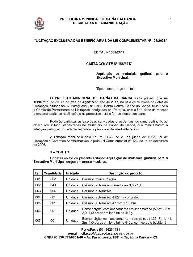 PREFECTURE MUNICIPAL DE CAPO DA CANON SECRETARIAT DE ADMINISTRAO1LICITAO EXCLUSIVE WAS BENEFICIARIES DA LEI COMPLEMENTARY N 123×2006 EDIT AL N 338×2017CARTA CONVICTED N 158×2017 Aquino de materials
