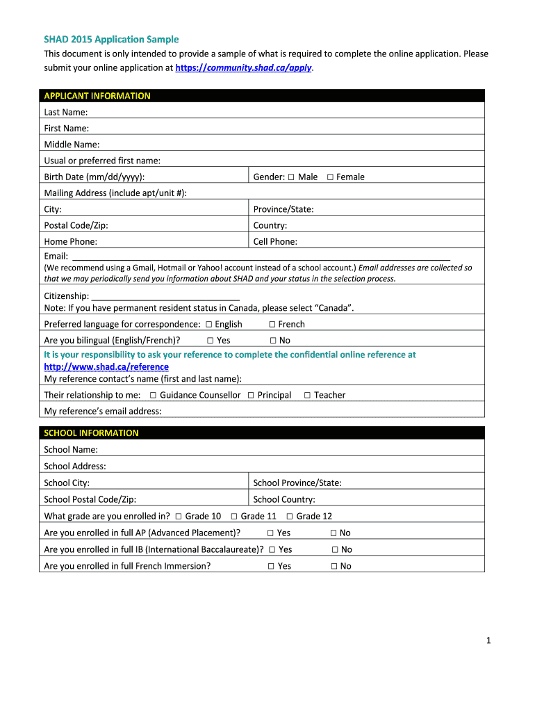 SHAD 2015 Application Sample This document is only intended to provide a sample of what is required to complete the online application. Please submit your online application at https://community.shad.ca/apply.