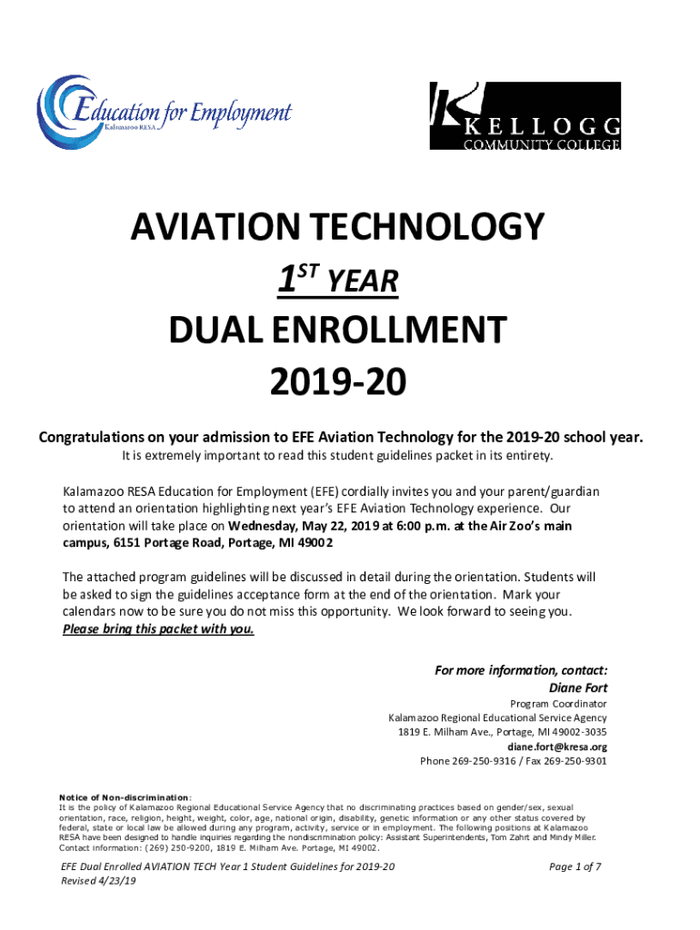 AVIATION TECHNOLOGY 1ST YEAR DUAL ENROLLMENT 201920 Congratulations on your admission to EYE Aviation Technology for the 201920 school year. It is extremely important to read this student guidelines