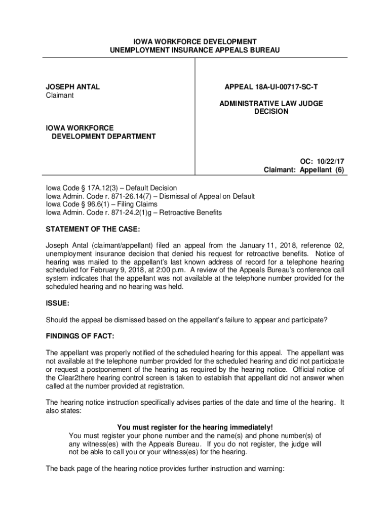 IOWA WORKFORCE DEVELOPMENT UNEMPLOYMENT INSURANCE APPEALS BUREAUJOSEPH ANAL ClaimantAPPEAL 18AUI00717SCT ADMINISTRATIVE LAW JUDGE DECISIONING WORKFORCE DEVELOPMENT DEPARTMENT: 10×22/17 Claimant: