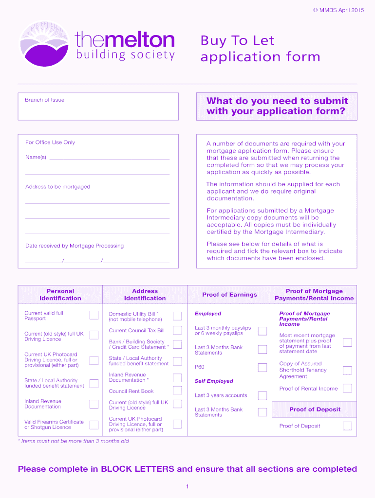 MOBS April 2015 Buy To Let application form Branch of Issue What do you need to submit with your application form? For Office Use Only A number of documents are required with your mortgage application