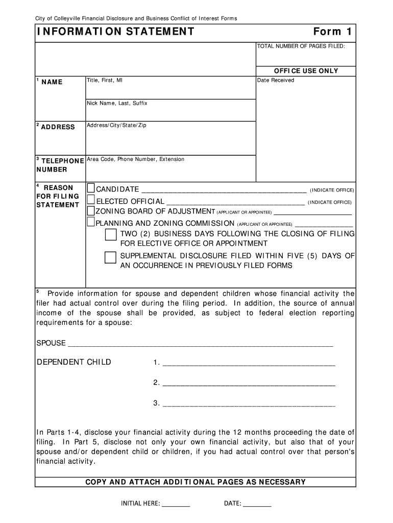 City of Coffeyville Financial Disclosure and Business Conflict of Interest Forms INFORMATION STATEMENT Form 1 TOTAL NUMBER OF PAGES FILED: OFFICE USE ONLY 1 NAME Title, First, MI Date Received Nick