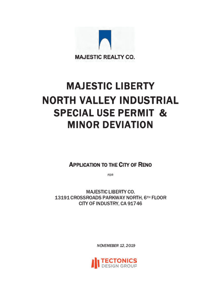 MAJESTIC LIBERTY NORTH VALLEY INDUSTRIAL SPECIAL USE PERMIT & MINOR DEVIATIONAPPLICATION TO THE CITY OF RENO MAJESTIC LIBERTY CO. 13191 CROSSROADS PARKWAY NORTH, 6TH FLOOR CITY OF INDUSTRY, CA 91746NOVEMEBER