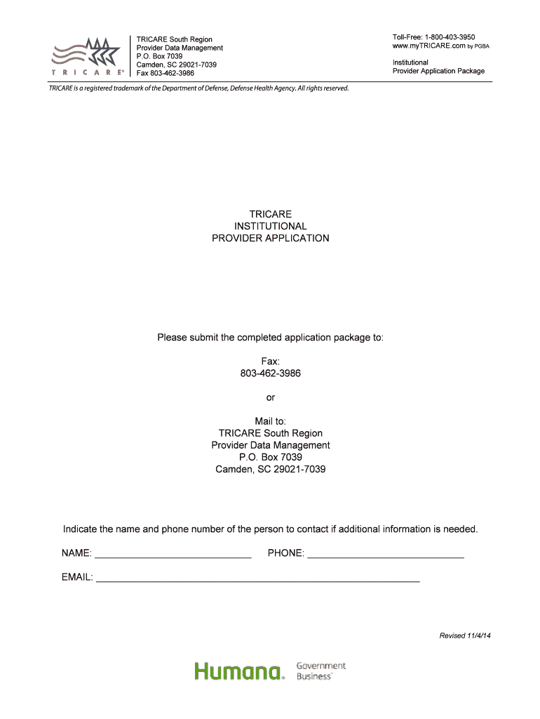 Print Form Toll-Free: 1-800-403-3950 www.myTRICARE.com by PBA TRI CARE South Region Provider Data Management P.O. Box 7039 Camden, SC 29021-7039 Fax 803-462-3986 Institutional Provider Application