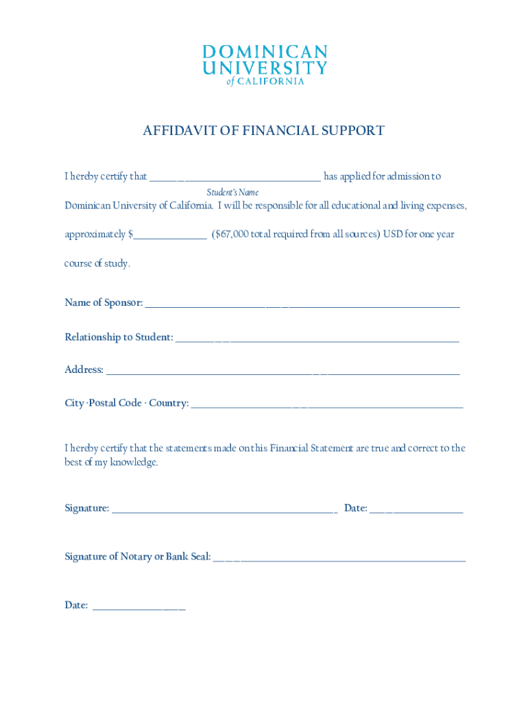 AFFIDAVIT OF FINANCIAL SUPPORT I hereby certify that ___ has applied for admission to Students Name Dominican University of California. I will be responsible for all educational and living expenses,