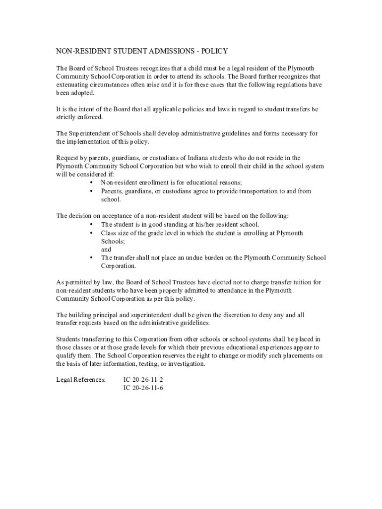 NONRESIDENT STUDENT ADMISSIONS POLICY The Board of School Trustees recognizes that a child must be a legal resident of the Plymouth Community School Corporation in order to attend its schools. The