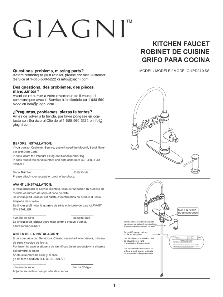KITCHEN FAUCET ROBIN ET DE CUISINE GR IFO PARA CORINA Questions, problems, missing parts?MODEL / MODE / MODEL #PD240SSBefore returning to your retailer, please contact Customer Service at 18885605222