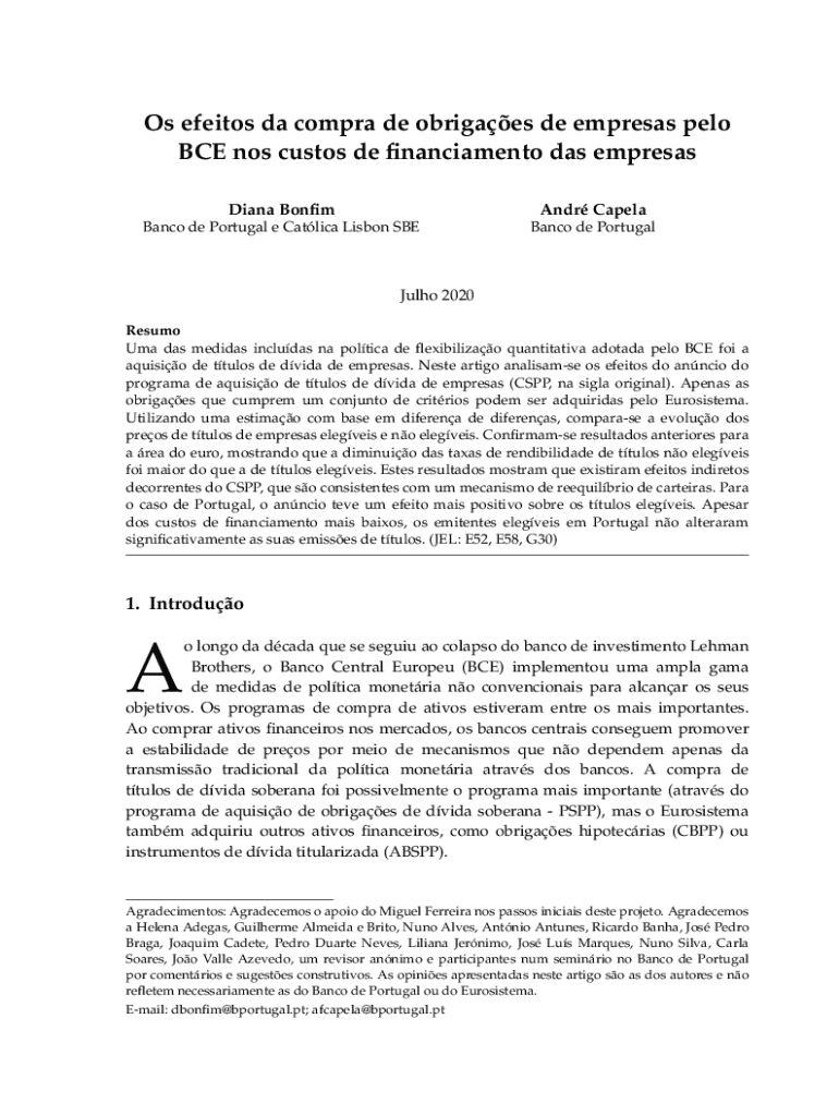 Os efeitos da compra de obrigaes de empresas pelo BCE nos custos de financiamento das empresas Diana BonfimAndr CapelaBanco de Portugal e Catlica Lisbon SBEBanco de PortugalJulho 2020 Resumo Uma das