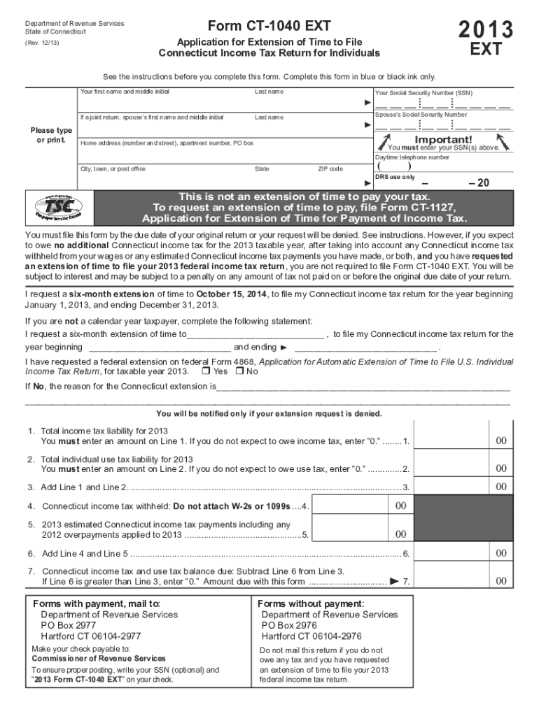 Department of Revenue Services State of Connecticut2013Form CT1040 EXT Application for Extension of Time to File Connecticut Income Tax Return for Individuals×Rev. 12×13)Extreme the instructions