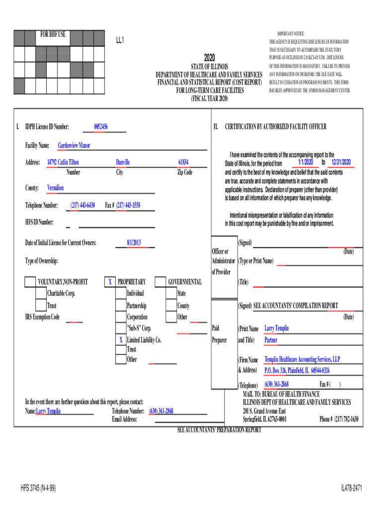 FOR BHF USELL1 2020STATE OF ILLINOIS DEPARTMENT OF HEALTHCARE AND FAMILY SERVICES FINANCIAL AND STATISTICAL REPORT (COST REPORT) FOR LONGER CARE FACILITIES (FISCAL YEAR 2020× I.DPH License ID Number: