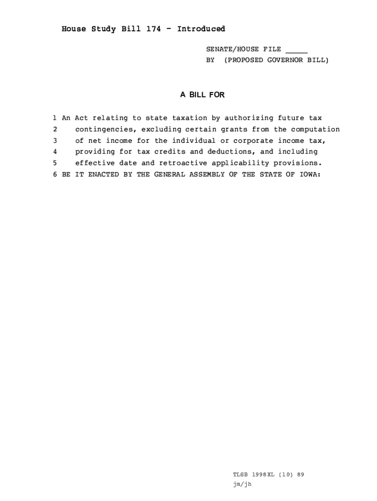 House Study Bill 174 Introduced SENATE×HOUSE FILE ___ BY (PROPOSED GOVERNOR BILL×A BILL FOR1 An Act relating to state taxation by authorizing future tax 2 contingencies, excluding certain grants