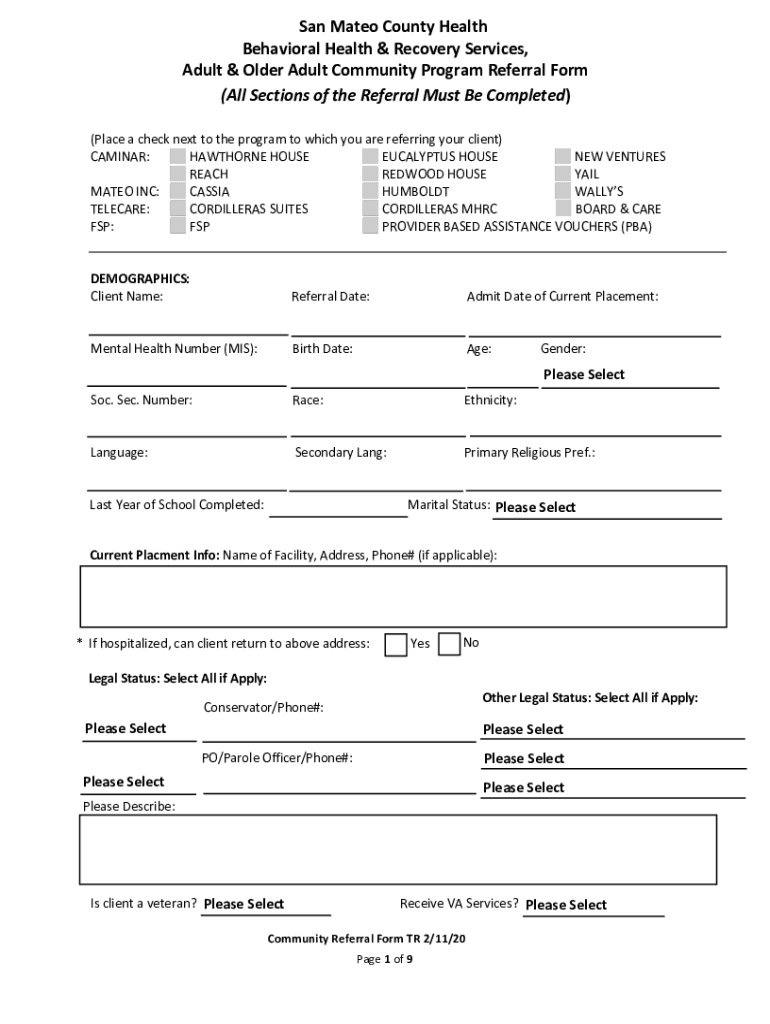 San Mateo County Health Behavioral Health & Recovery Services, Adult & Older Adult Community Program Referral Form (All Sections of the Referral Must Be Completed) (Place a check next to the program