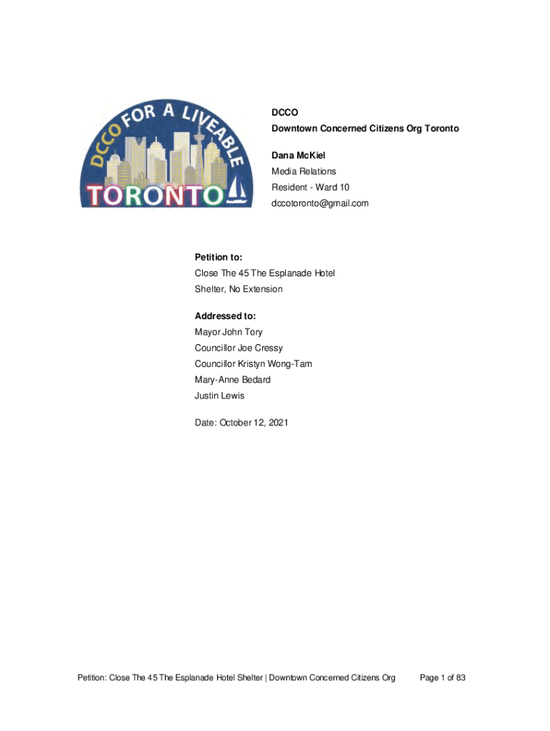 DCC Downtown Concerned Citizens Org Toronto Dana McKain Media Relations Resident Ward 10 dccotoronto×Gmail.competition to: Close The 45 The Esplanade Hotel Shelter, No Extension Addressed to: Mayor
