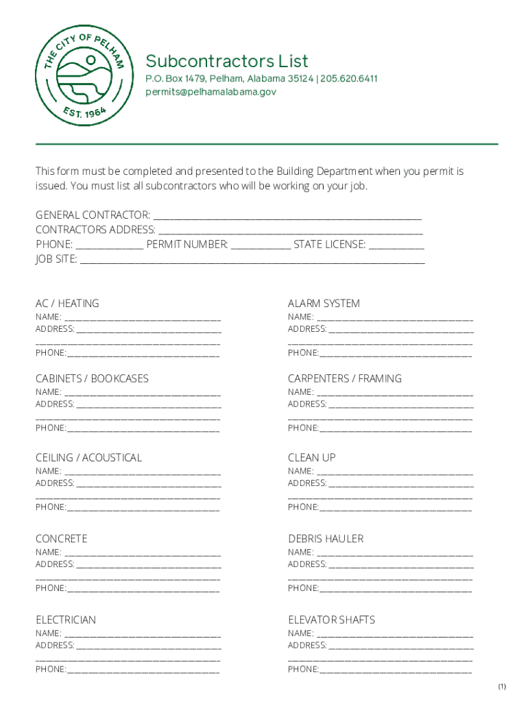 Subcontractors List P.O. Box 1479, Pelham, Alabama 35124 × 205.620.6411 permits×pelhamalabama. Gothic form must be completed and presented to the Building Department when your permit is issued.
