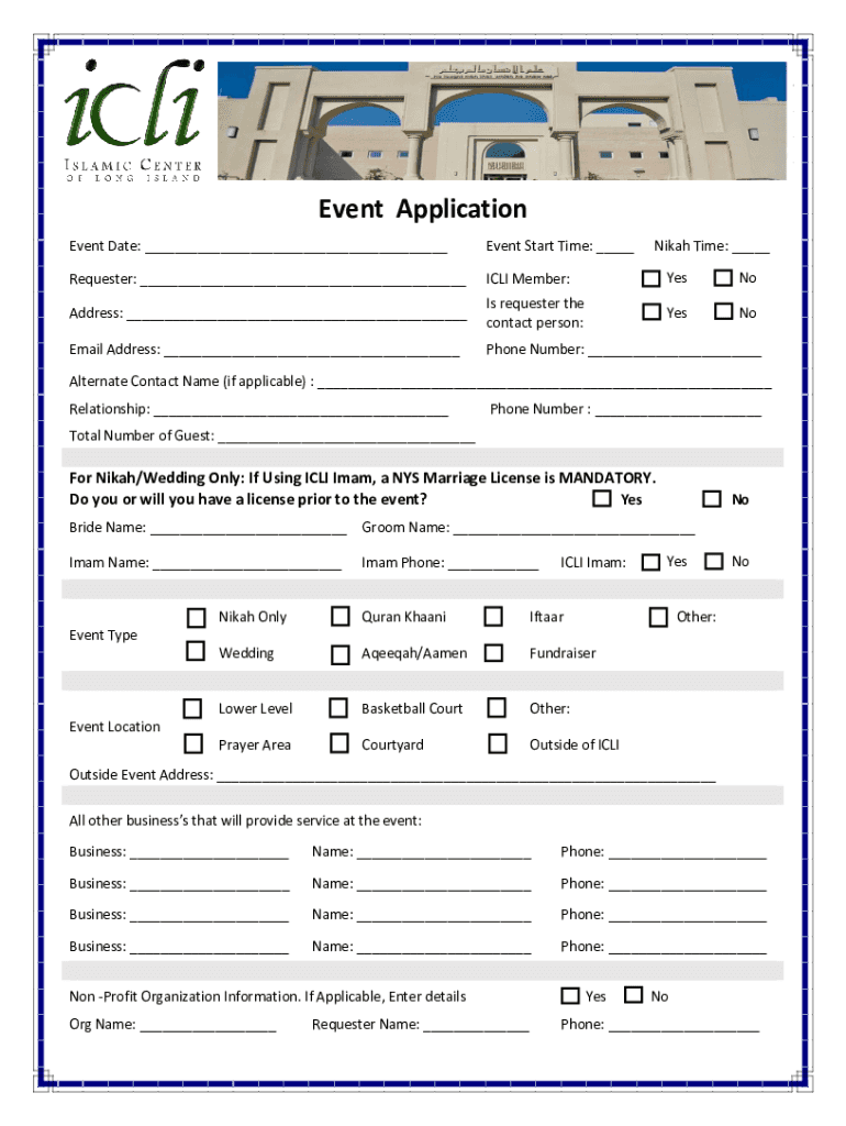 Event Application Event Date: ___Event Start Time: ___Ninth Time: ___Requester: ___ICL Member:YesNoAddress: ___Is requester the contact person:YesNoEmail Address: ___Phone Number: ___Alternate Contact