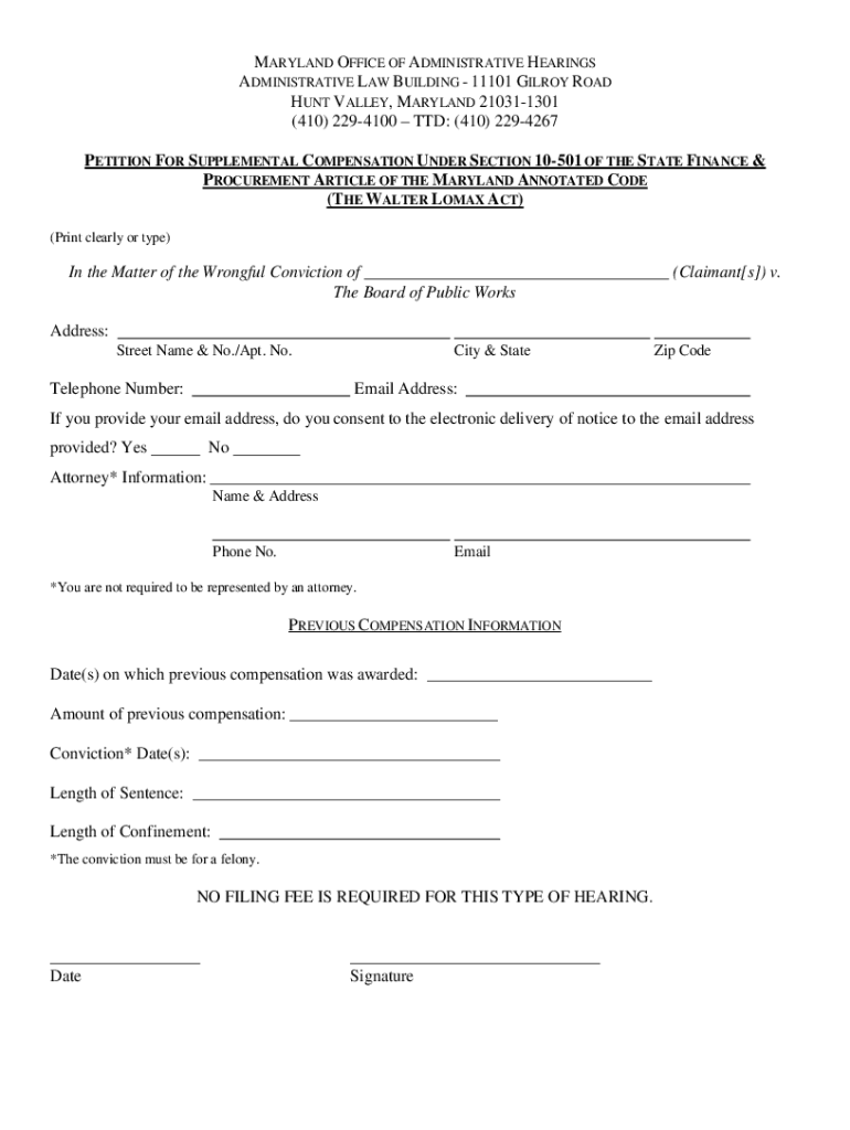 MARYLAND OFFICE OF ADMINISTRATIVE HEARINGS ADMINISTRATIVE LAW BUILDING 11101 GILROY ROAD HUNT VALLEY, MARYLAND 210311301 ×410× 2294100 TTD: (410× 2294267 PETITION FOR SUPPLEMENTAL COMPENSATION