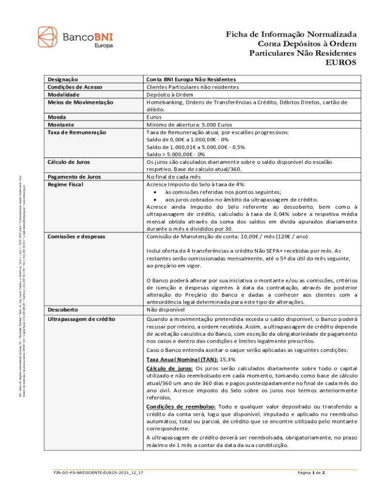 FICA de Informao Normalized Contra Deposits Order Particulars No Residents EUROS Design Candies de Acesso Modalidade Mass de Movimentao Moved Mont ante Taxa de RemuneraoBNI Banco de Negcios International