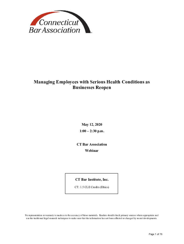 Managing Employees with Serious Health Conditions as Businesses Reopen May 12, 2020 1:00 2:30 p.m. CT Bar AssociationWebinar CT Bar Institute, Inc. CT: 1.5 CLE Credits (Ethics) No representation or