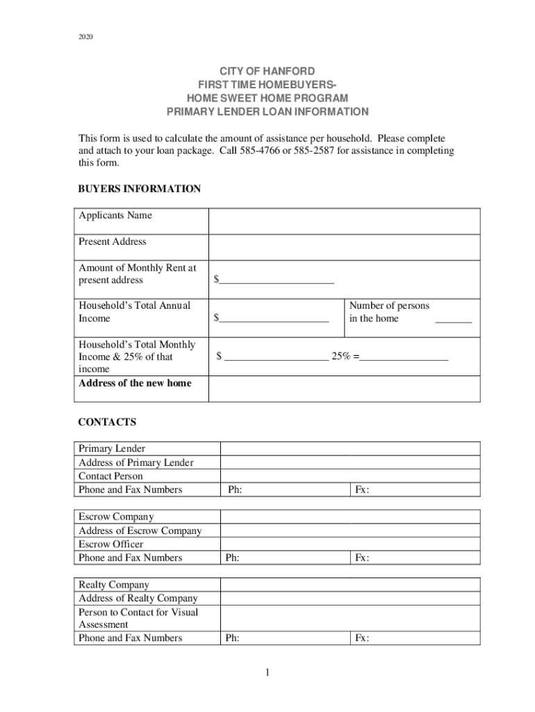 2020CITY OF HANFORD FIRST TIME HOMEBUYERSHOME SWEET HOME PROGRAM PRIMARY LENDER LOAN INFORMATION This form is used to calculate the amount of assistance per household. Please complete and attach to