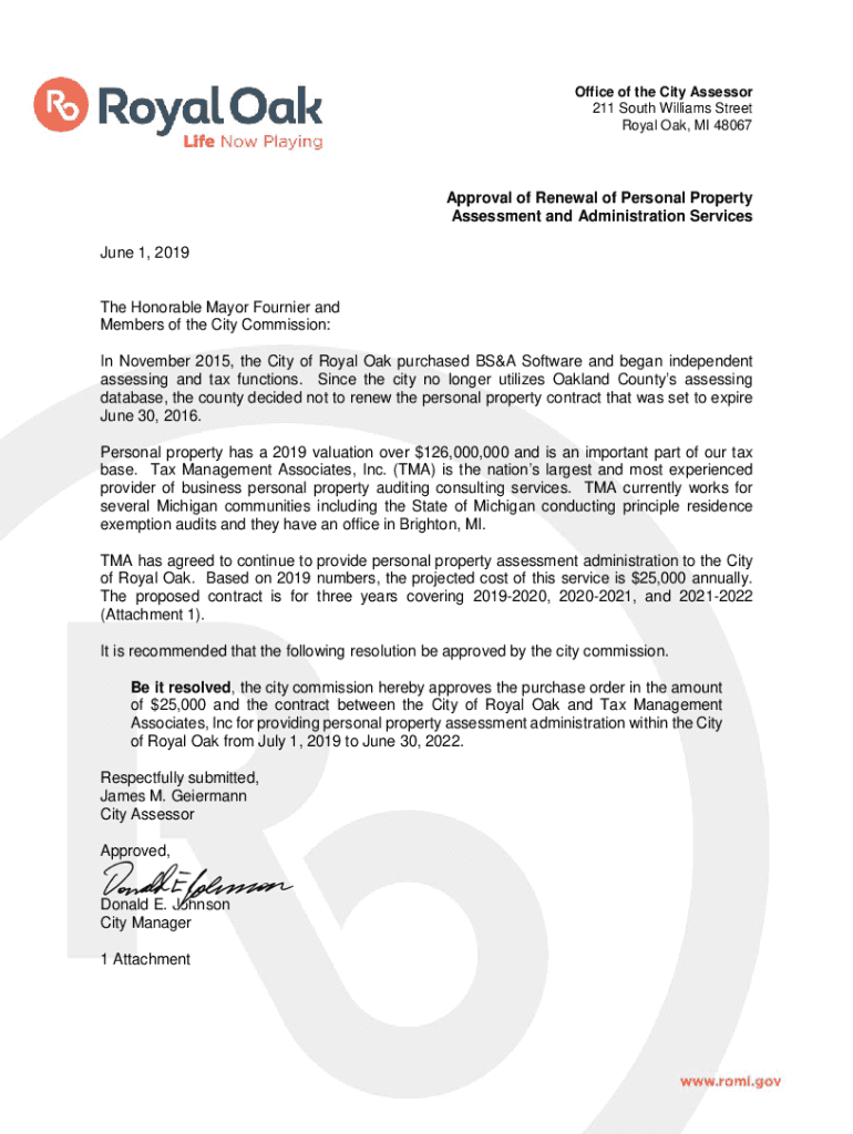 Office of the City Assessor 211 South Williams Street Royal Oak, MI 48067Approval of Renewal of Personal Property Assessment and Administration Services June 1, 2019The Honorable Mayor Fournier and