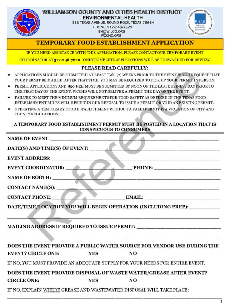 WILLIAMSON COUNTY AND CITIES HEALTH DISTRICT ENVIRONMENTAL HEALTH355 TEXAS AVENUE, ROUND ROCK, TEXAS 78664 PHONE: 5122487620 EH×WILCOX.ORG WC CHD.CONTEMPORARY FOOD ESTABLISHMENT APPLICATION IF YOU