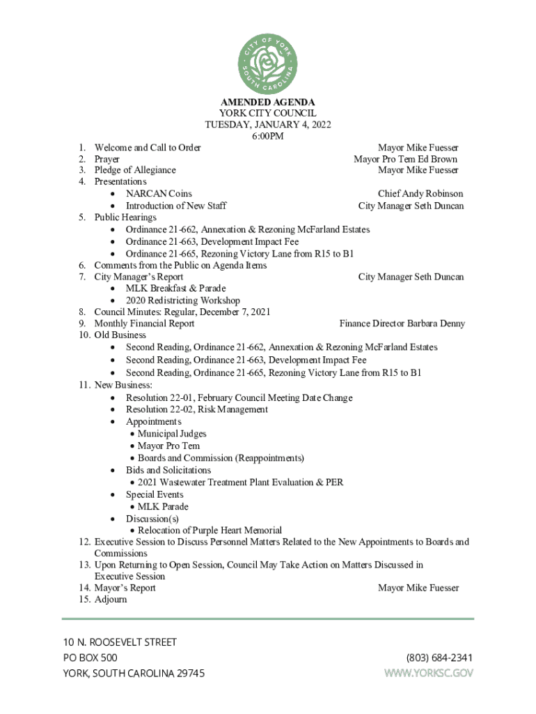 1. 2. 3. 4. 5.6. 7. 8. 9. 10.11.12. 13. 14. 15.AMENDED AGENDA YORK CITY COUNCIL TUESDAY, JANUARY 4, 2022 6:00PMWelcome and Call to Order Mayor Mike Guesser Prayer Mayor Pro Tem Ed Brown Pledge of