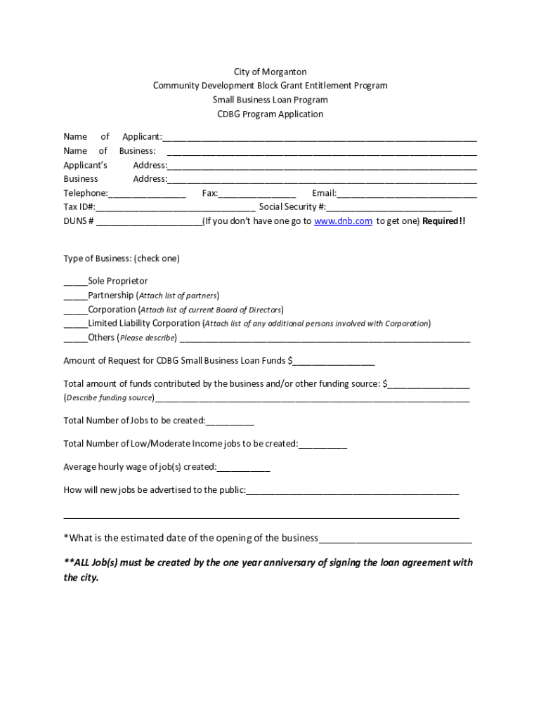 City of Morgantown Community Development Block Grant Entitlement Program Small Business Loan Program CBG Program Application Name of Applicant:___ Name of Business: ___ Applicants Address:___ Business