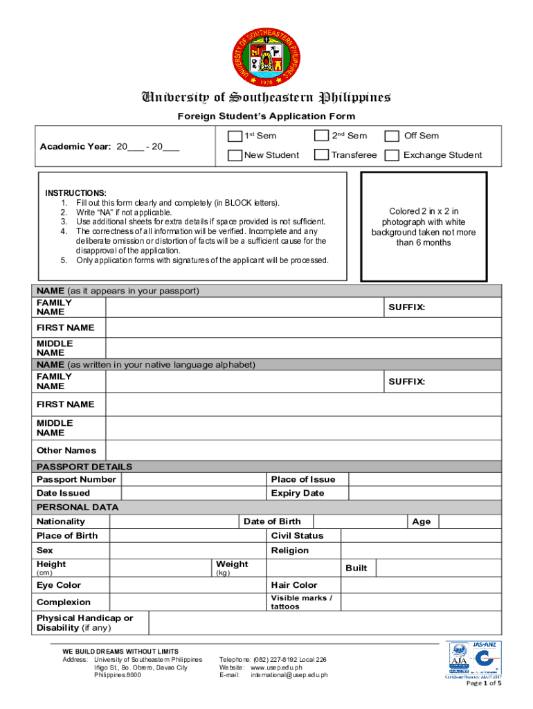 University of Southeastern Philippines Foreign Students Application Form Academic Year: 20___ 20___1st Sem2nd Scoff Renew StudentTransfereeExchange StudentINSTRUCTIONS: 1. Fill out this form clearly