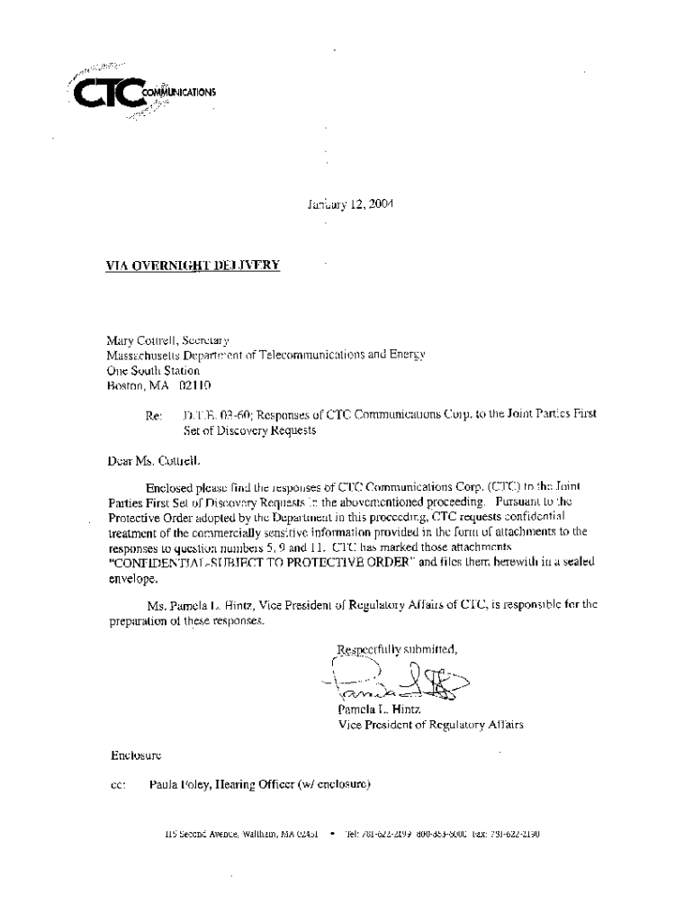 CTC Communications Corp. D.T.E. 0360 Responses Joint ALEC Data Requests Responsible Person:Pamela HintzResponse Date:January 12, 2004JOINT PARTIES1: Please state whether you are either an incumbent