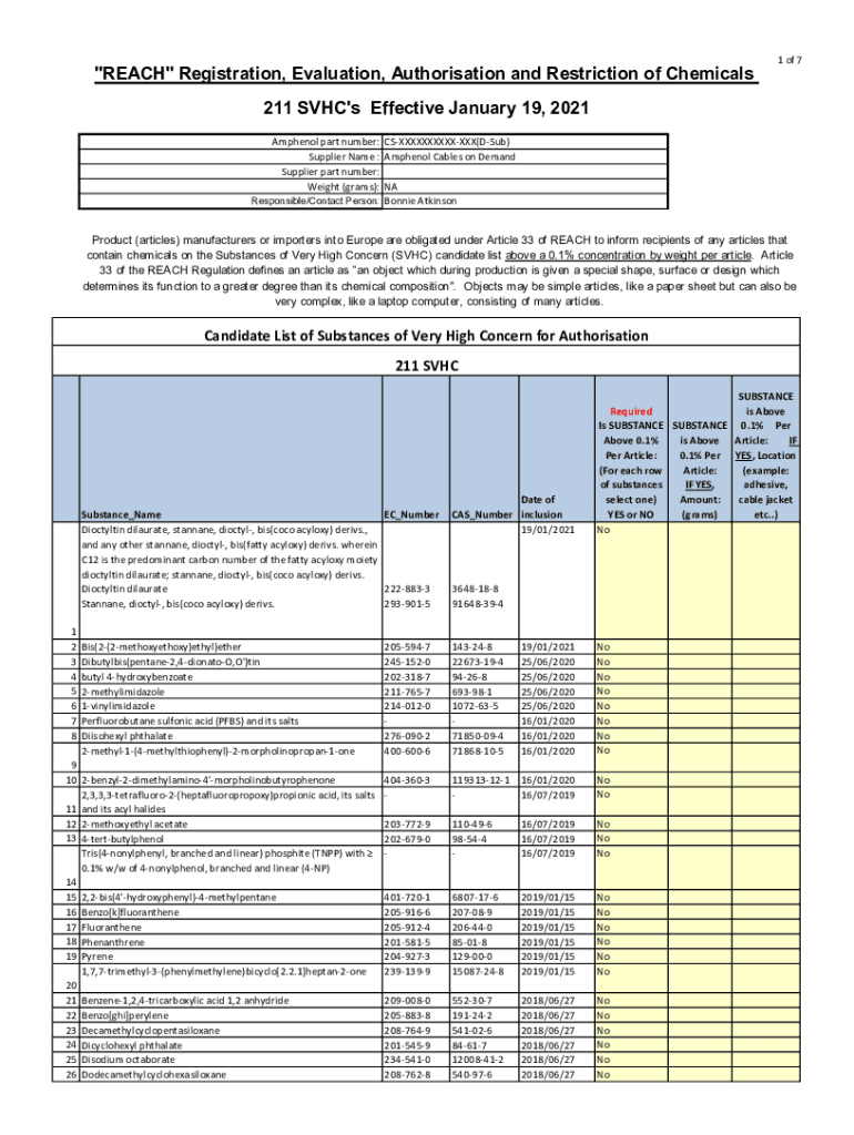 \” REACH\” Registration, Evaluation, Authorization and Restriction of Chemicals1 of 7211 SVC\'s Effective January 19, 2021, Am phenol part number: CSXXXXXXXXXXXXX×Sub) Supplier Name : Am phenol