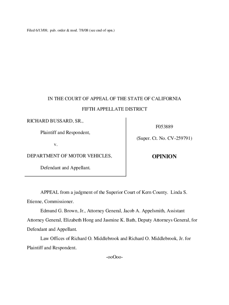 Filed 6×13/08; pub. Order & mod. 7×8/08 (see end of on.×IN THE COURT OF APPEAL OF THE STATE OF CALIFORNIA FIFTH APPELLATE DISTRICT RICHARD BUSS ARD, SR., F053889 Plaintiff and Respondent, (Super.