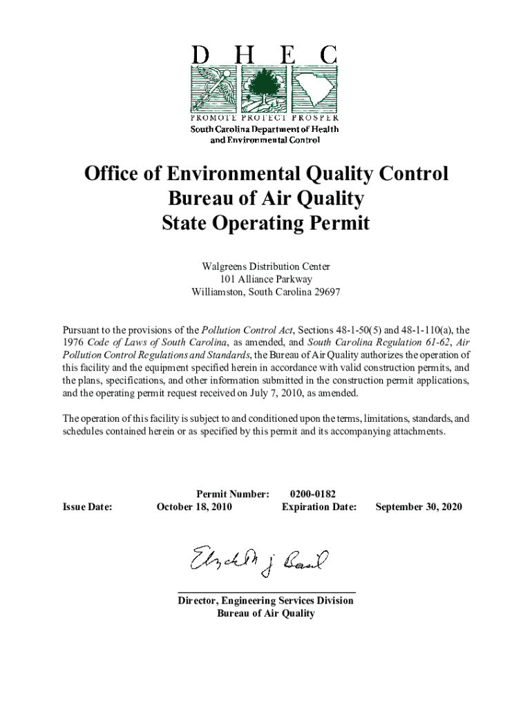 Office of Environmental Quality Control Bureau of Air Quality State Operating Permit Walgreens Distribution Center 101 Alliance Parkway Williamson, South Carolina 29697Pursuant to the provisions of