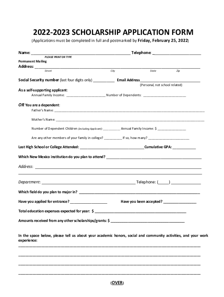20222023 SCHOLARSHIP APPLICATION FORM (Applications must be completed in full and postmarked by Friday, February 25, 2022)Name: ___ Telephone: ___ PLEASE PRINT OR TYPEPermanent MailingAddress: ___