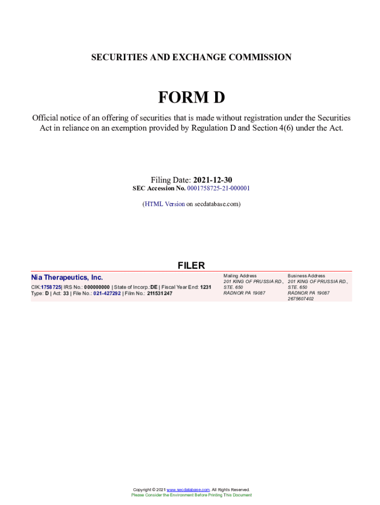 Get the free Nia Therapeutics, Inc. Form D Filed 2021-12-30. Accession Number