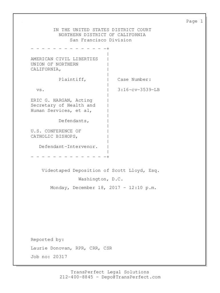 Page 1 IN THE UNITED STATES DISTRICT COURT NORTHERN DISTRICT OF CALIFORNIA San Francisco Division + | AMERICAN CIVIL LIBERTIES | UNION OF NORTHERN | CALIFORNIA, | | Plaintiff, | | vs. | | ERIC G.