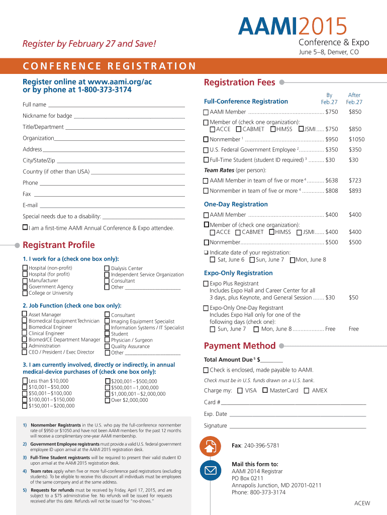 Register by February 27 and Save! C O N F E R E N C E R E G I S T R AT I O N Register online at www.aami.org/ac or by phone at 18003733174 Full name Nicknames for badge Registration Fees By After