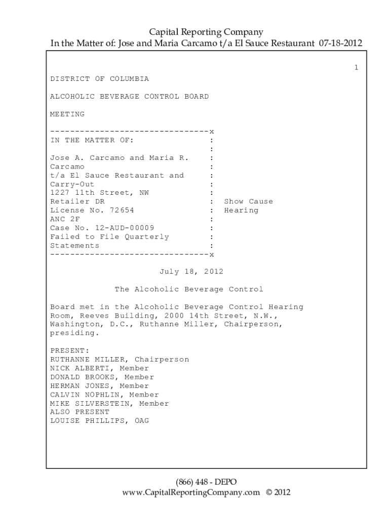 Capital Reporting Company In the Matter of: Jose and Maria Cacao t×an El Sauce Restaurant 07182012 1 DISTRICT OF COLUMBIA ALCOHOLIC BEVERAGE CONTROL BOARD MEETING x IN THE MATTER OF: : : Jose A.