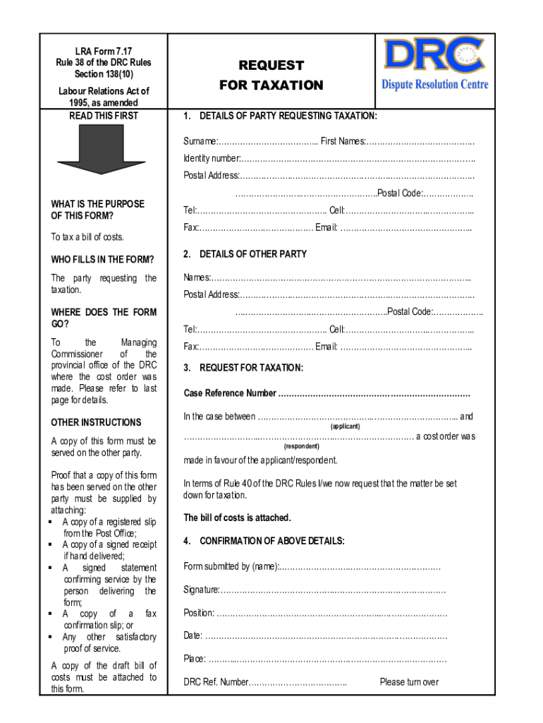 ERA Form 7.17 Rule 38 of the DRC Rules Section 138×10) Labor Relations Act of 1995, as amended READ THIS FIRSTREQUEST FOR TAXATION 1. DETAILS OF PARTY REQUESTING TAXATION: Surname:. First Names:.