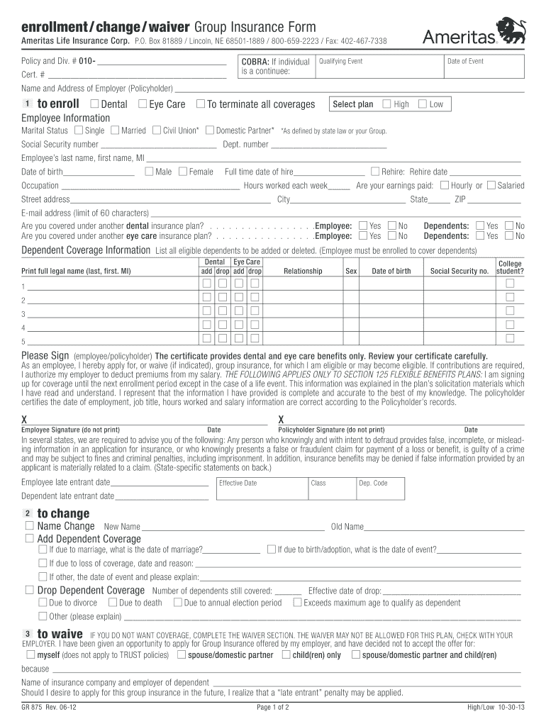 CLEAR FORM enrollment / change / waiver Group Insurance Form Americas Life Insurance Corp. P.O. Box 81889 / Lincoln, NE 68501-1889 / 800-659-2223 / Fax: 402-467-7338 Policy and Div. # 010- Cert. #
