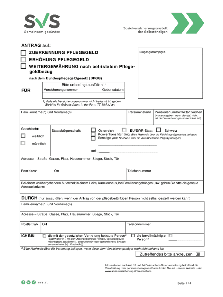 LeerformularANTRAG AUF: EingangsstampiglieZUERKENNUNG PFLEGEGELD REHUNG PFLEGEGELD WEITERGEWHRUNG each befristetem Pflegegeldbezug each them Bundespflegegeldgesetz (BGG×Bitter unbending Allen 1)